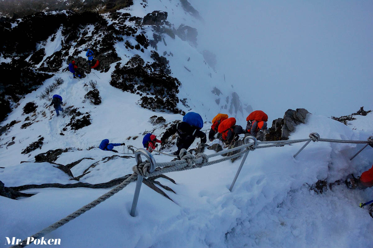 在審馬陣山屋短暫休息後,我們步上征討五岩峰的路途,此時天氣突然轉陰,兇險的五岩峰彷彿是前往南湖大山的守門人;此時海拔已來到3,500m,我們也裝上冰爪以應付接下來的雪地路段,第一次用冰爪的我,心裡忐忑接下來的路程。