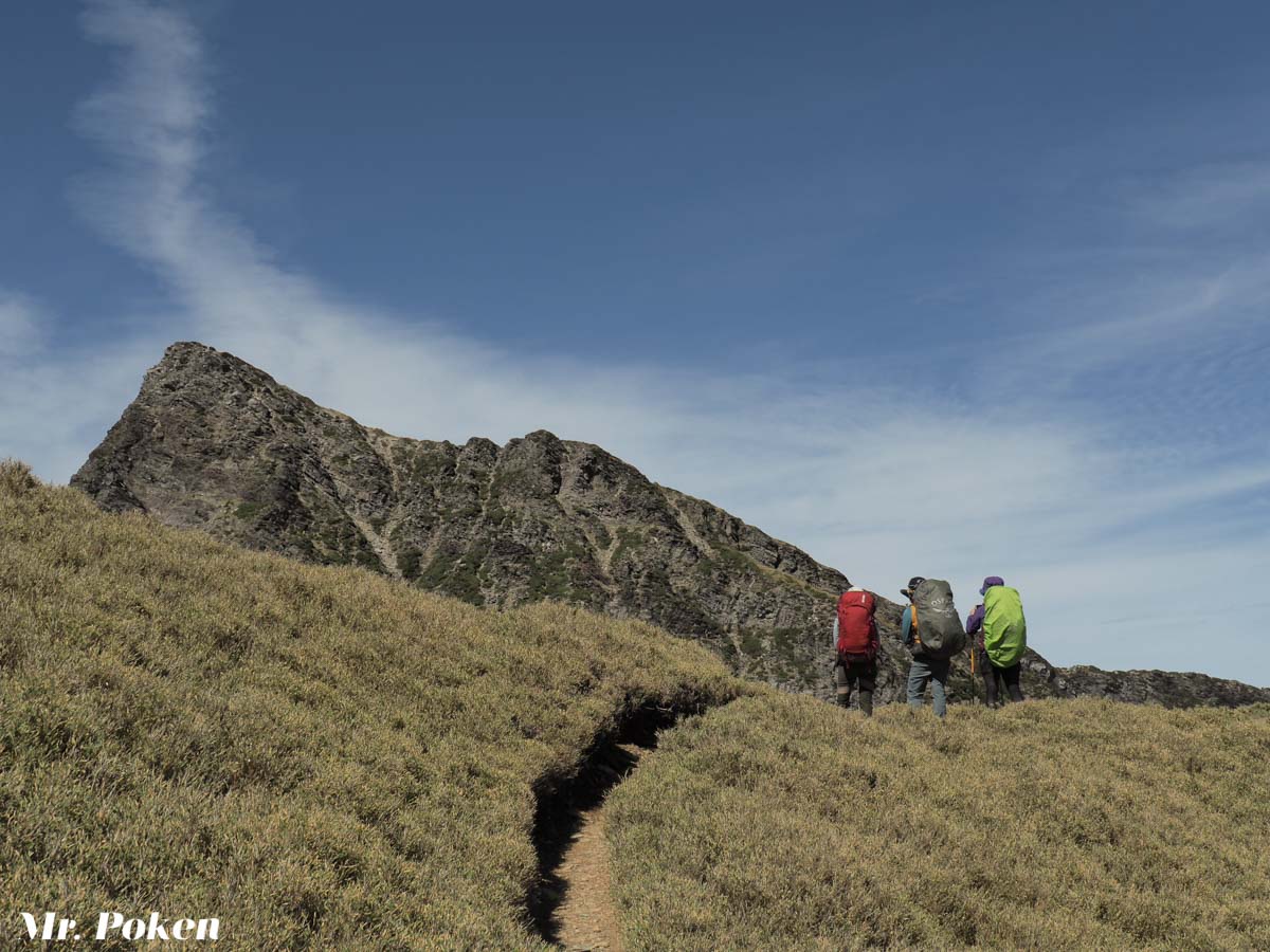 從成功山屋上至奇萊稜線這段路,路程雖然才1.1K,但海拔爬升超過560公尺來到H3420m高度,我們花了將近3小時才來到這壯闊的稜線,看著風和日麗下的金黃草原,感受著這片壯闊與舒坦。